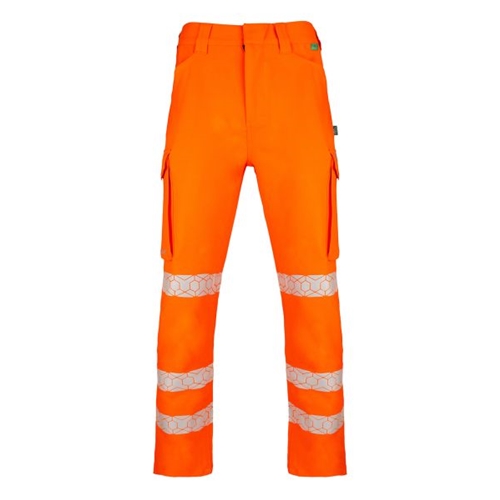Envirowear High Visibility trousers designed to be recycled, using mono-fibre design principles. rPet generated can be used in all kinds of polyester clothing and accessories. Made from 240gsm 100% polyester twill fabric. Features triple sewn seams for durability, 7 belt loop waistband, 2 cargo pockets and hexpatterned heatseal Retro-Reflective tape. available in short, regular and tall sizes. Machine washable at 40 degrees C up to a maximum of 25 cycles.